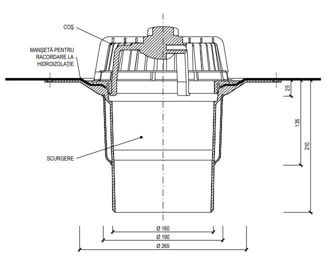 Receptor cu perete dublu TOPWET, cu flanșă din membrană bituminoasă, parafrunzar și ieșire verticală 160mm