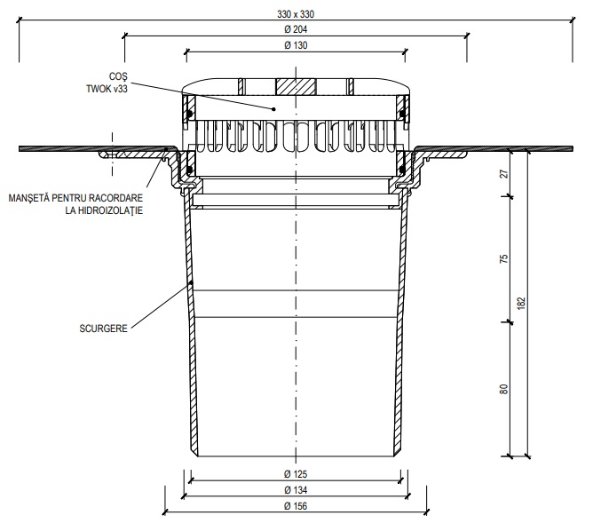 Receptor terasa flansa din membrana bituminoasa, iesire verticala DN110