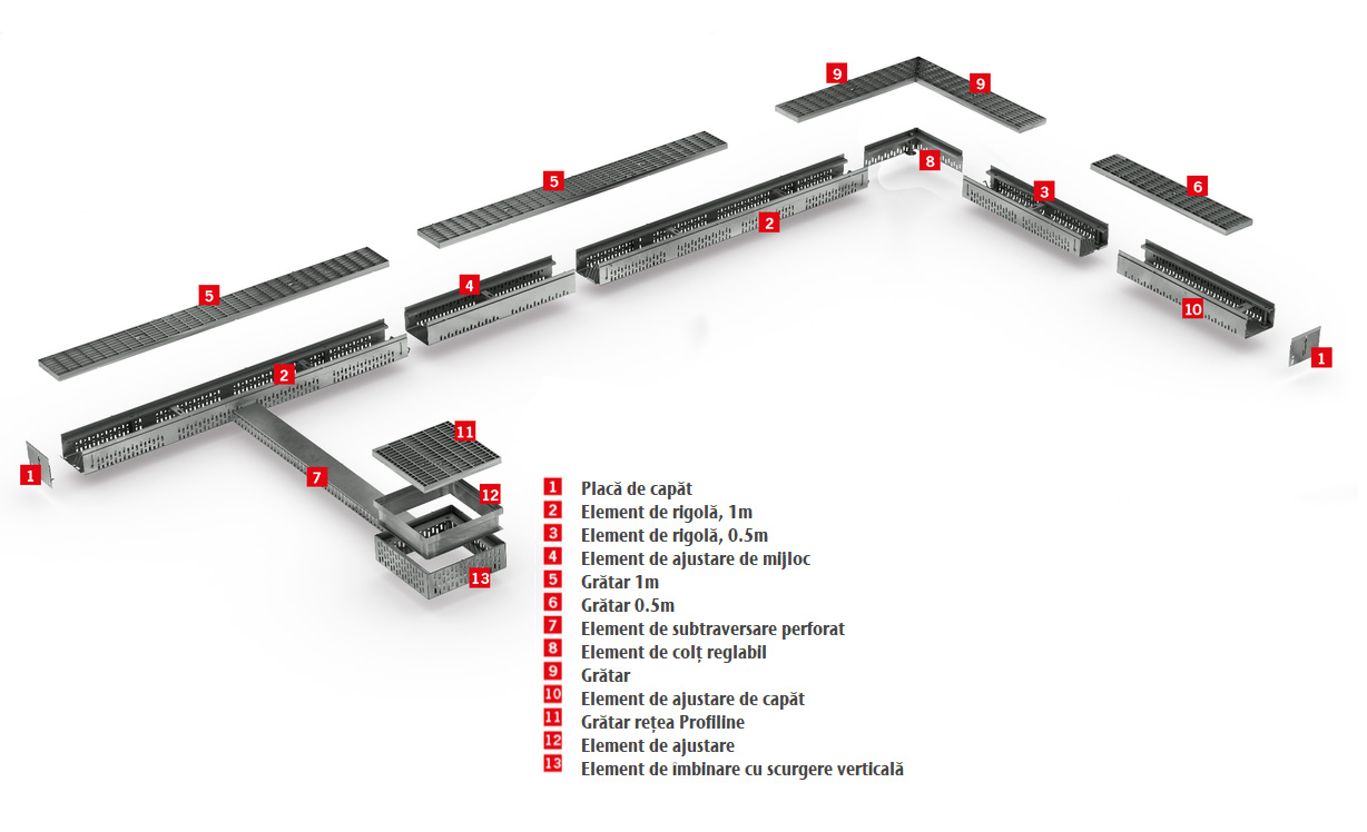 ACO Profiline este o gamă de rigole din oțel zincat sau din oțel inox special destinate instalării pe terase cu finisaj permeabil. În cazul în care ultimul strat al terasei este realizat cu pietriș, pavele, dale sau cu pardoseală flotantă, apele pluviale se vor impregna în finisaj și vor avea nevoie să fie drenate de pe hidroizolație de un sistem de rigole cu preluare laterală. O gama largă de grătare și de accesorii permit relizarea unor configurații tehnice complexe. O atenție deosebită este acordată descărcărilor, care trebuie să străpungă în siguranță hidroizolația terasei, fără să apară infiltrații la etajele inferioare.