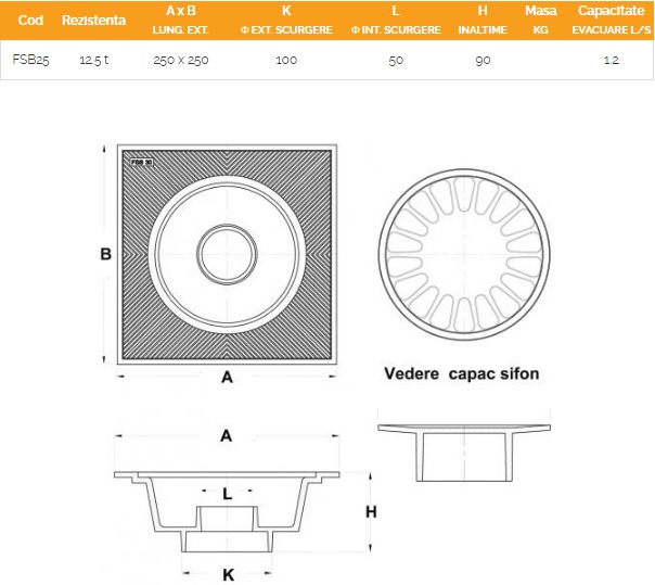 Sifon fonta cu gratar detasabil, clasa B125, 250×250 mm, DN110 mm, FSB25